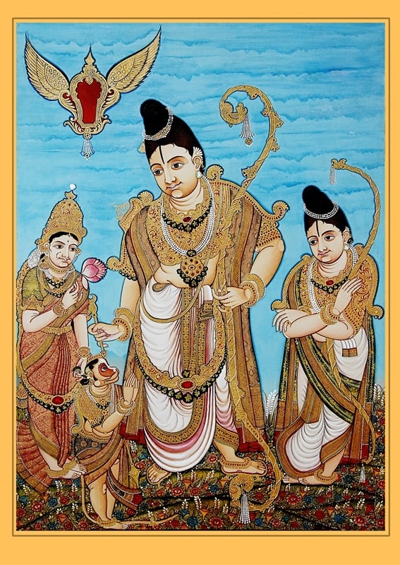 Sita to the right and Lakshmana to the left of Lord Sri Rama and Sri Hanuman is instanding posture in front of Sri Rama unlike other traditional pictures of Sri Rama where Sitadevi stands to the left and Lakshmana is to the right of Sri Rama and Hanuman can be seen sitting in front of them.